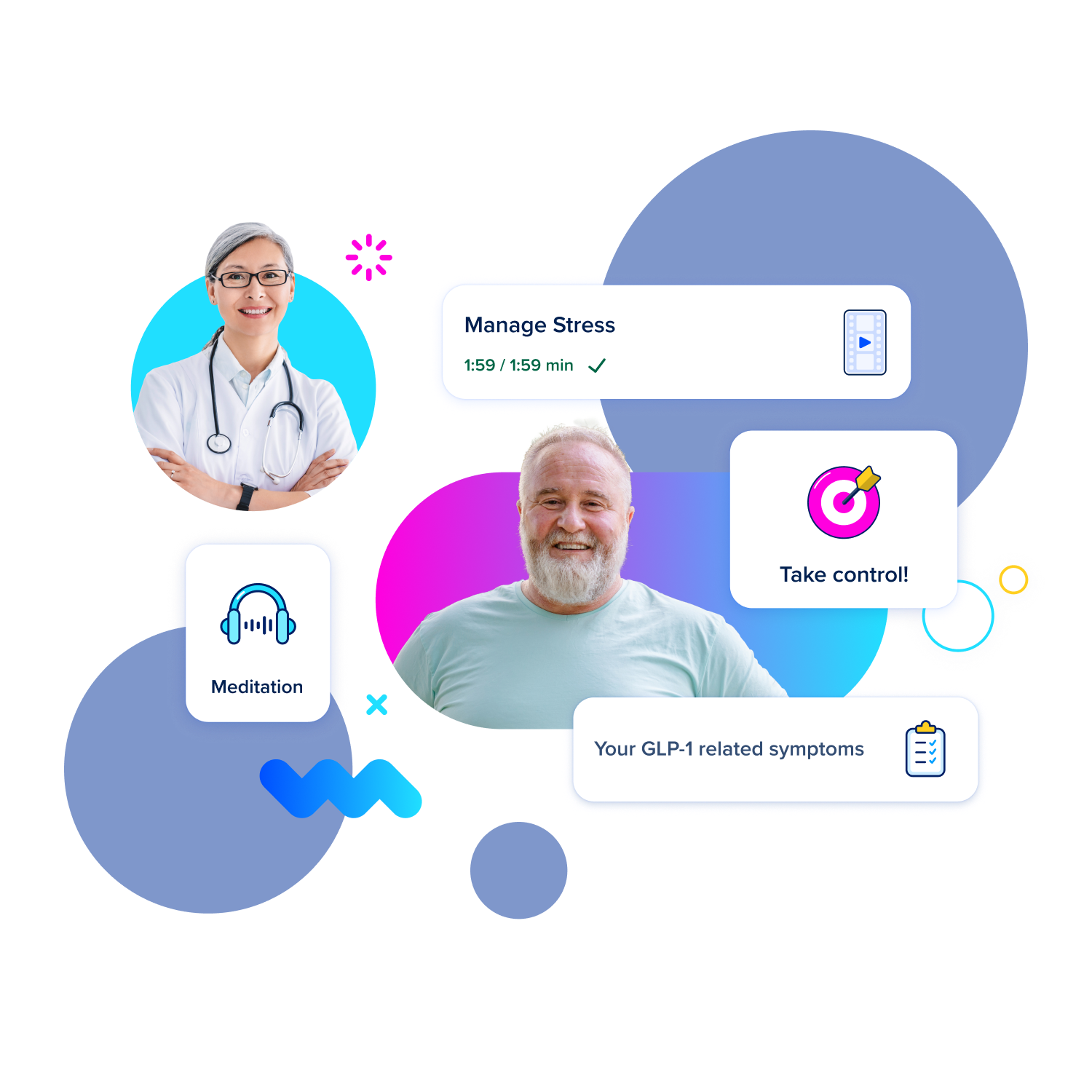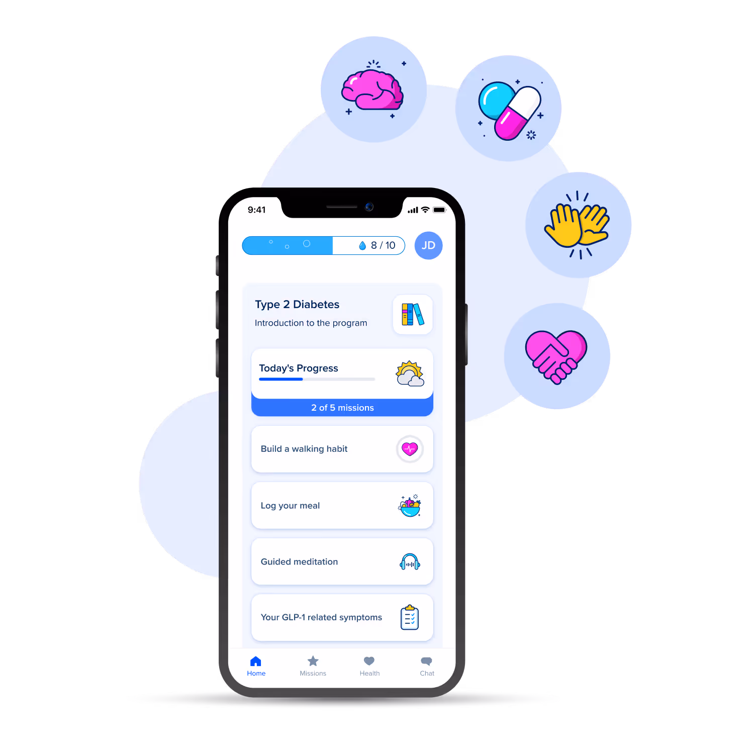 Daily missions guide users through structured tasks that encourage healthy habits that matter for patients prescribed GLP-1. This includes nutrition tips to manage side effects, stress management and physical activity.