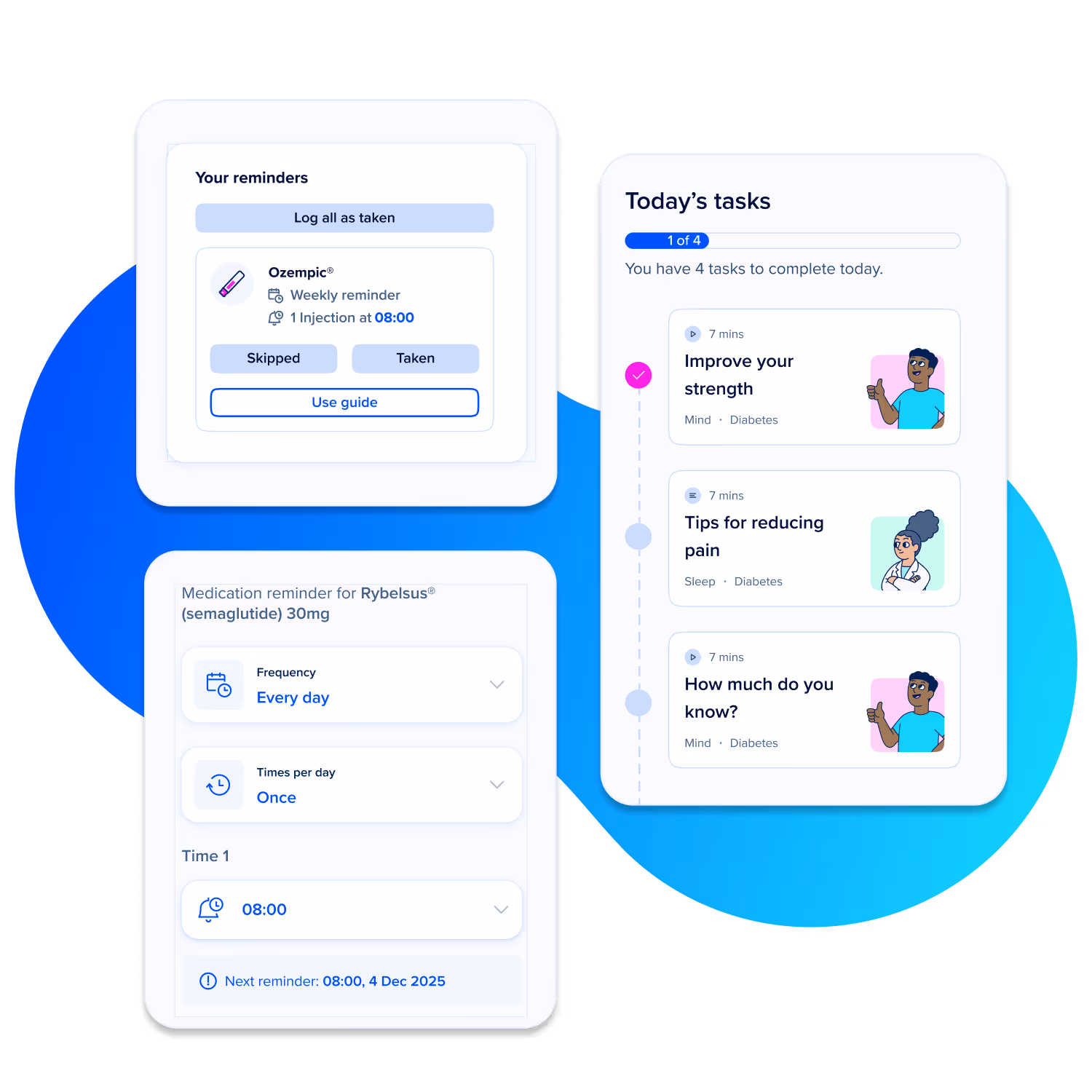 Medication consistency: Medication reminders and symptom tracking encourage patients to stay consistent with Rybelsus® or Ozempic®.